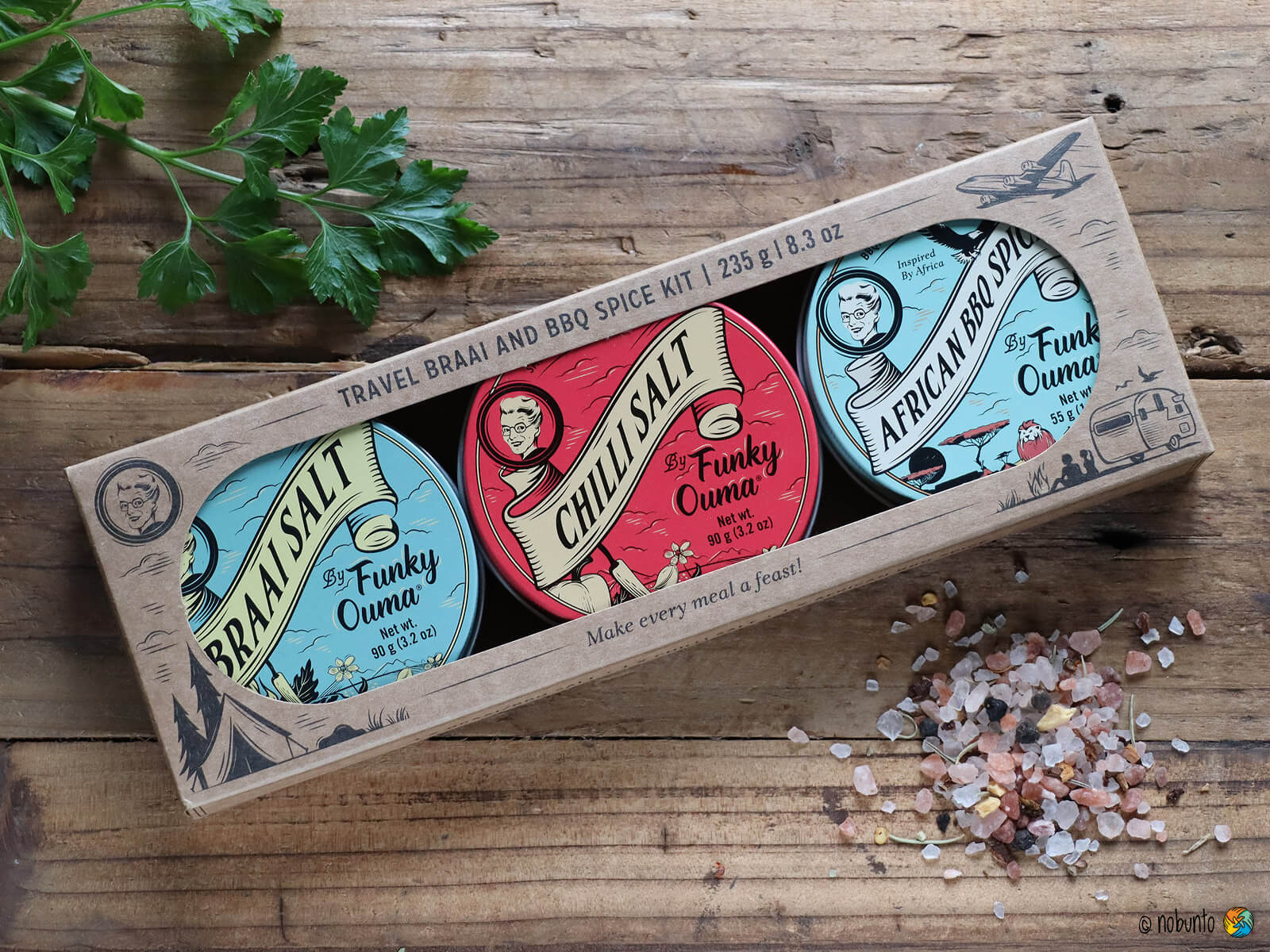 1 x Braai Salt 90 g, 1 x Chilli Salt 90 g, 1 x African BBQ Spice 55 g,