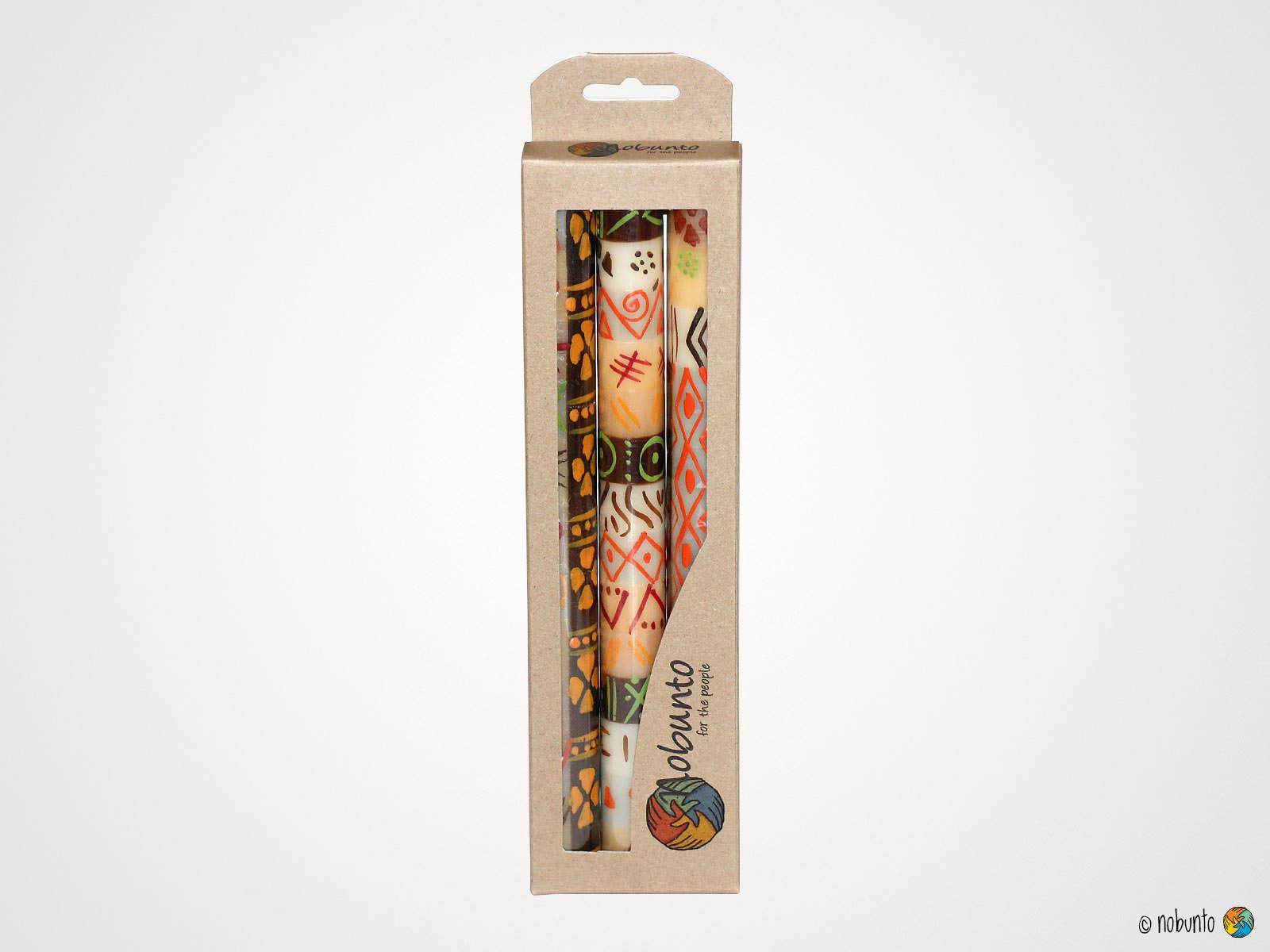 Jede einzelne unserer Kerzen wird in den Nobunto Werkstätten, nahe dem südlichsten Punkt Afrikas, kunstvoll von Hand gefertigt und bemalt. Jede Kerze ist ein kleines Kunstwerk, ein Unikat, denn keine gleicht der anderen. Die Muster jeder Kerze sind individuell , orientieren sich aber am Farbschema. Abweichungen in den Designs, Farben und Formen sind daher mit Freude zu genießen.