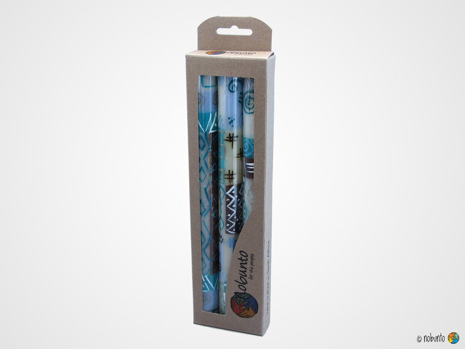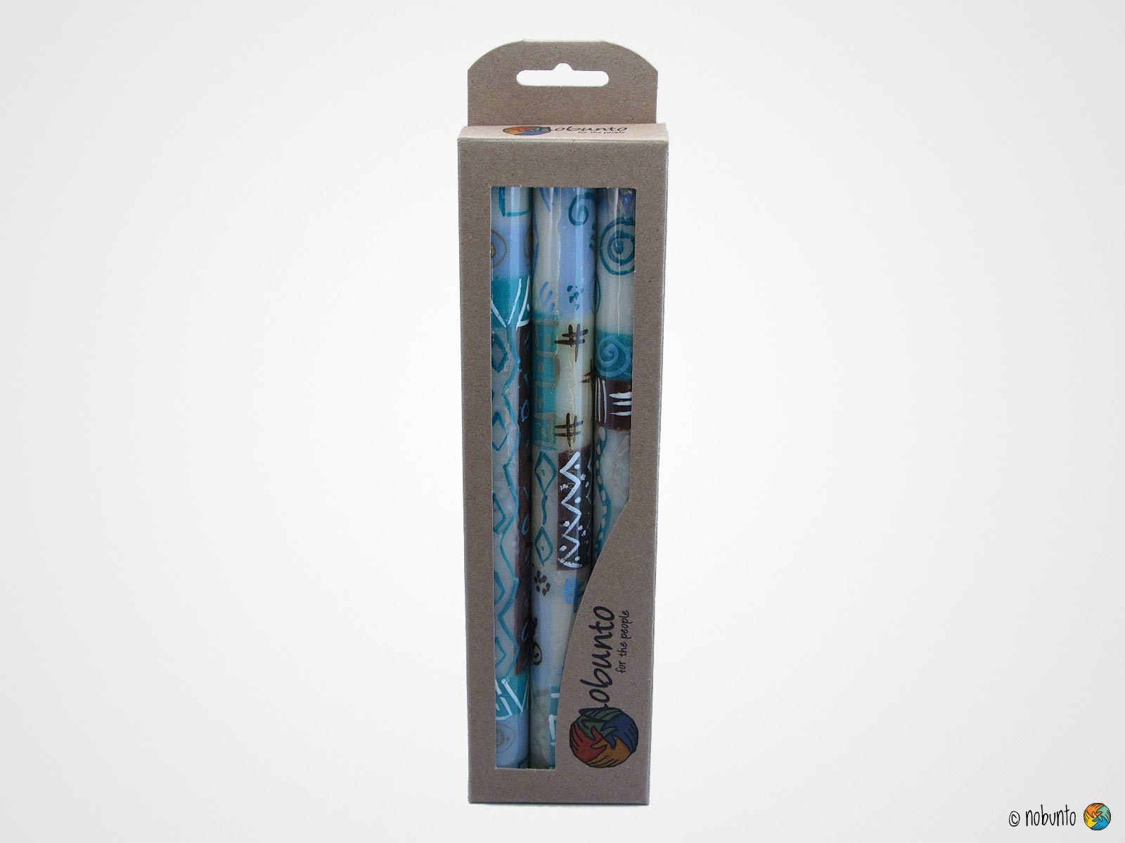 Jede einzelne unserer Kerzen wird in den Nobunto Werkstätten, nahe dem südlichsten Punkt Afrikas, kunstvoll von Hand gefertigt und bemalt. Jede Kerze ist ein kleines Kunstwerk, ein Unikat, denn keine gleicht der anderen. Die Muster jeder Kerze sind individuell , orientieren sich aber am Farbschema. Abweichungen in den Designs, Farben und Formen sind daher mit Freude zu genießen.