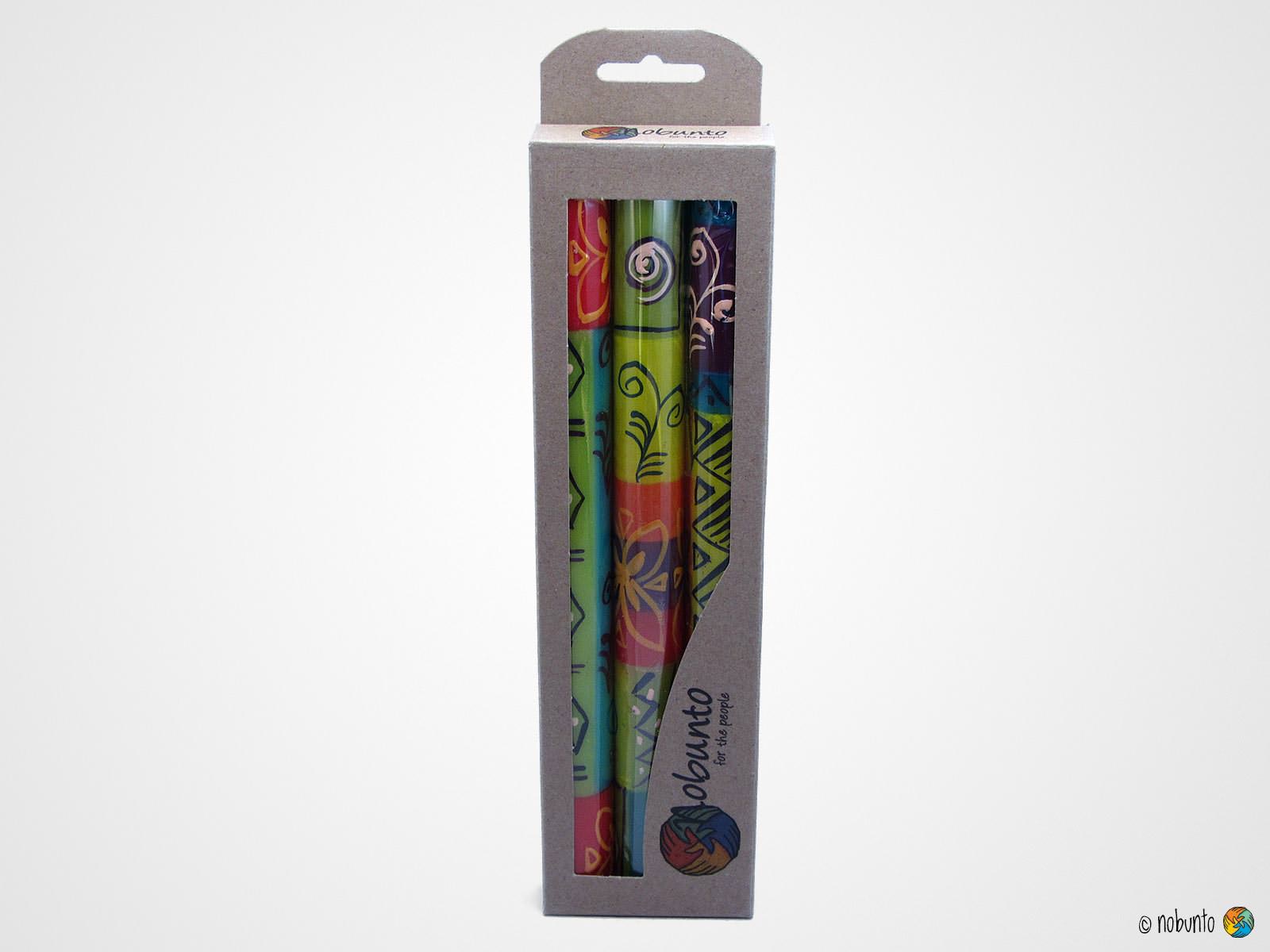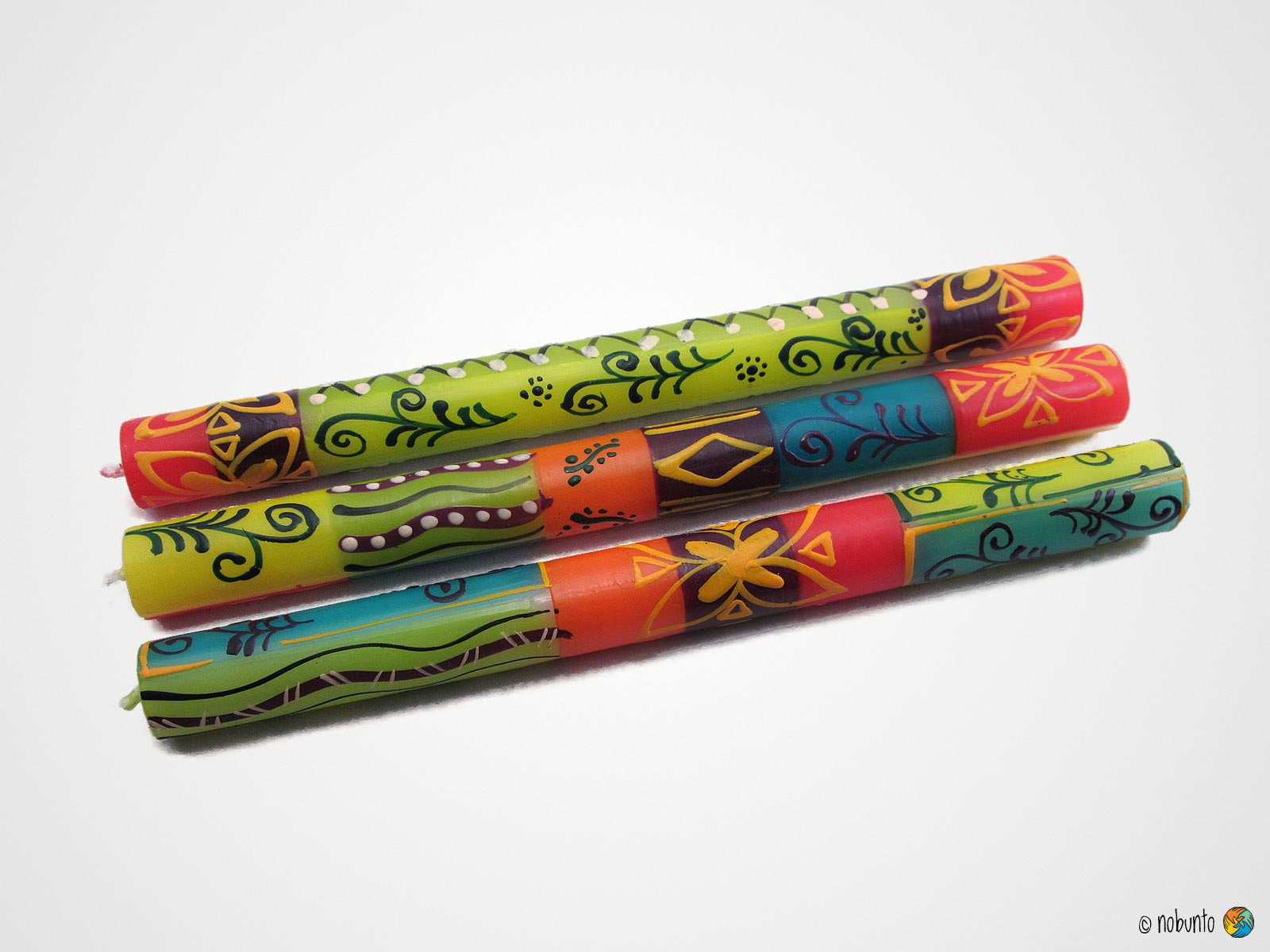 Jede einzelne unserer Kerzen wird in den Nobunto Werkstätten, nahe dem südlichsten Punkt Afrikas, kunstvoll von Hand gefertigt und bemalt. Jede Kerze ist ein kleines Kunstwerk, ein Unikat, denn keine gleicht der anderen. Die Muster jeder Kerze sind individuell , orientieren sich aber am Farbschema. Abweichungen in den Designs, Farben und Formen sind daher mit Freude zu genießen.