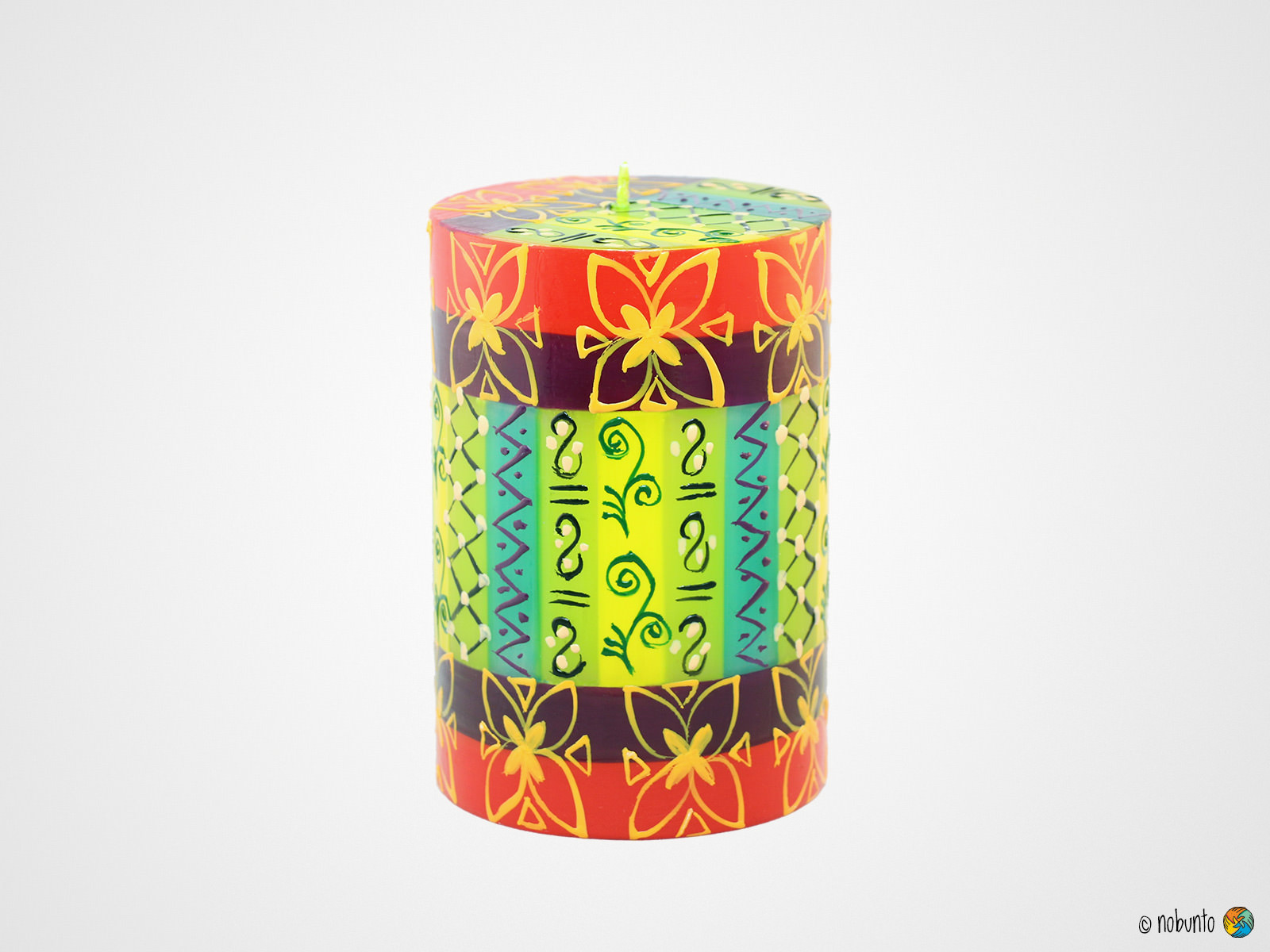 Jede einzelne unserer Kerzen wird in den Nobunto Werkstätten, nahe dem südlichsten Punkt Afrikas, kunstvoll von Hand gefertigt und bemalt. Jede Kerze ist ein kleines Kunstwerk, ein Unikat, denn keine gleicht der anderen. Die Muster jeder Kerze sind individuell , orientieren sich aber am Farbschema. Abweichungen in den Designs, Farben und Formen sind daher mit Freude zu genießen.